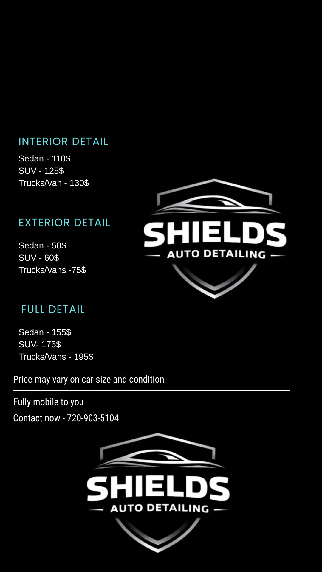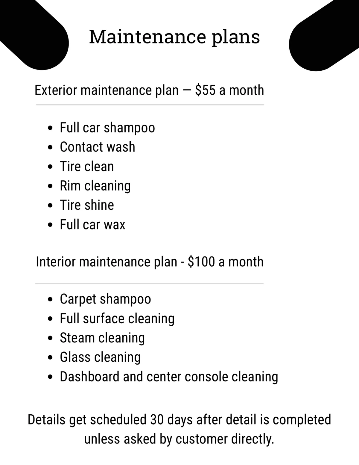 Detailing services usually depend on what kind of car and packages you have, but interior can take anywhere from 1-2 hour, exterior can take anywhere from 45 minutes to an hour, full details can take anywhere from 3-4 hours